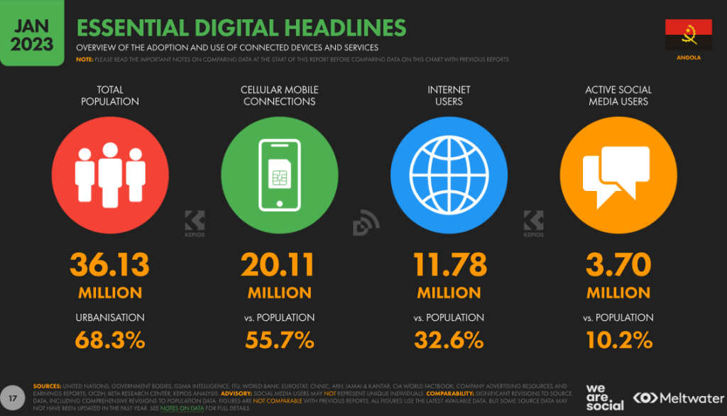 Kemp, S. (2023, February 13). Digital 2023: Angola — DataReportal – Global Digital Insights. DataReportal – Global Digital Insights. https://datareportal.com/reports/digital-2023-angola